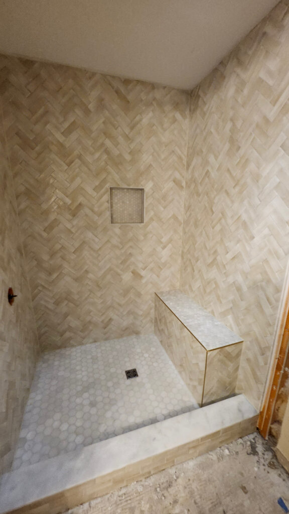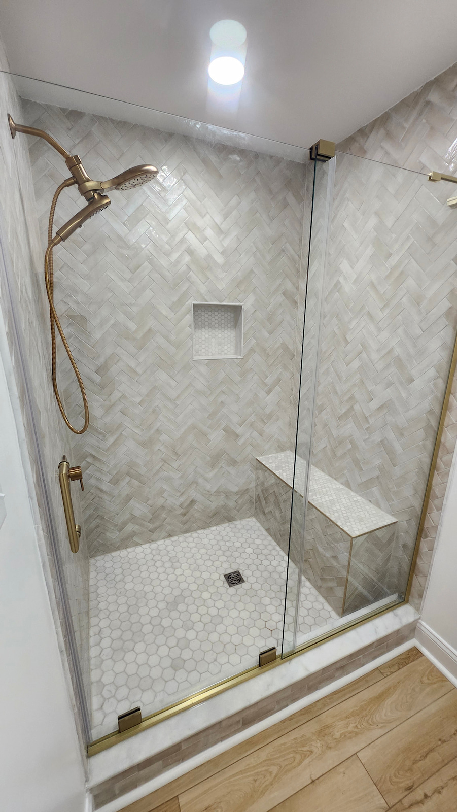 A Herringbone tile shower with bench and glass door, paired with new flooring and upgraded bathroom fixtures.
