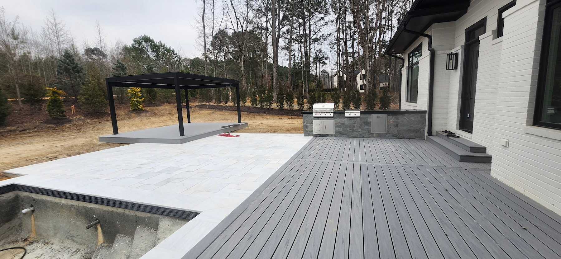 A modern deck with integrated grilling, a concrete pool, and a sleek pergola—built for both style and function.